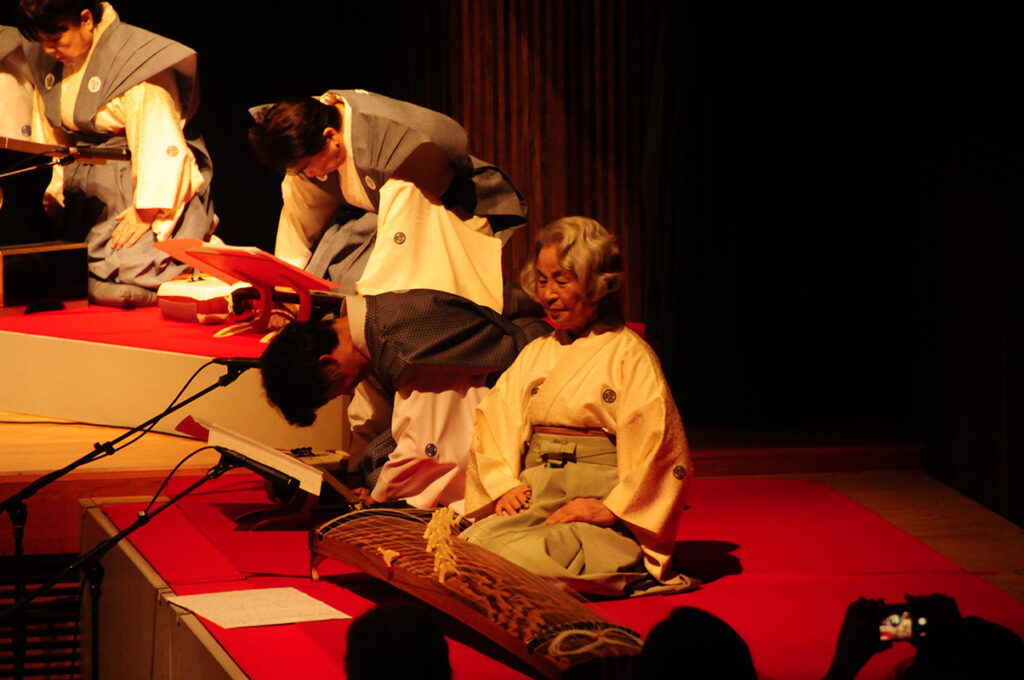 実は香翆座が暫くの活動中止から復帰した際、太夫、三味線は居ませんでした。テープレコーダーで公演していたこともあり、それまでは県の有形文化財のみでその後、太夫、三味線がそろって無形文化財をいただいた経緯があります。人形遣いは3人が一体となって人形を遣うとお話しましたが、人形浄瑠璃では人形遣い、太夫、三味線それぞれが一体となって演目を上演していく総合芸術なのです。